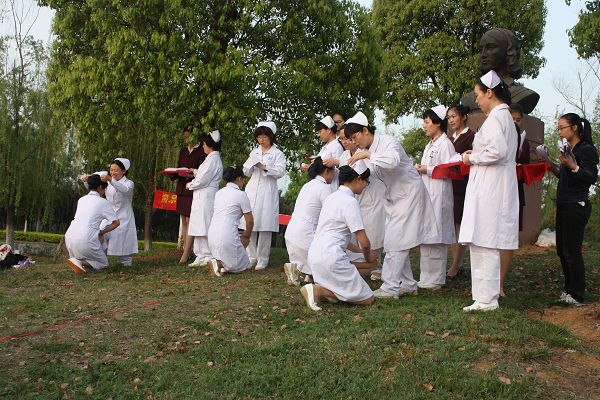 在南丁格尔的雕像前,伴随着庄严的音乐,09级护理同学直跪在护理前辈面前,老师们为她们戴上圣洁的燕帽,同学们接过老师手中的蜡烛,在孙国珍老师的带领下站在南丁格尔像前宣读誓言:我宣誓,谨奉人道主义精神,坚定救死扶伤的信念,履行“保护生命,减轻病痛,促进健康”的职责。我宣誓,遵守护士的职责道德规范,以真心,爱心和责任心对待每一位病人。永葆白衣天使的圣洁。我宣誓,求实进取,勤奋学习,忠于职守,热爱专业。我宣誓,永志今天的决心和誓言,接过前辈手中的蜡烛,燃烧自己,照亮别人,把毕生精力献给护理事业。