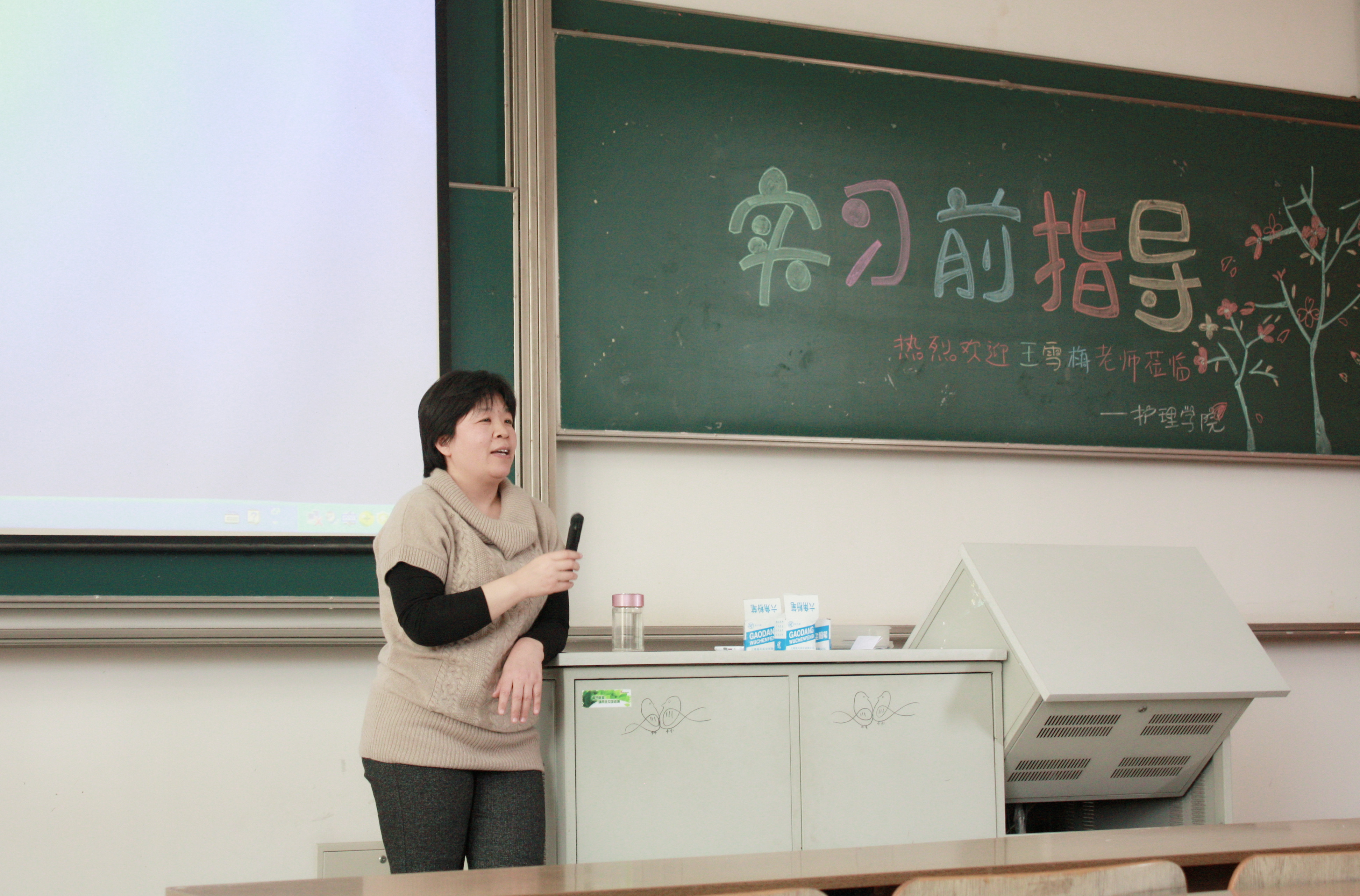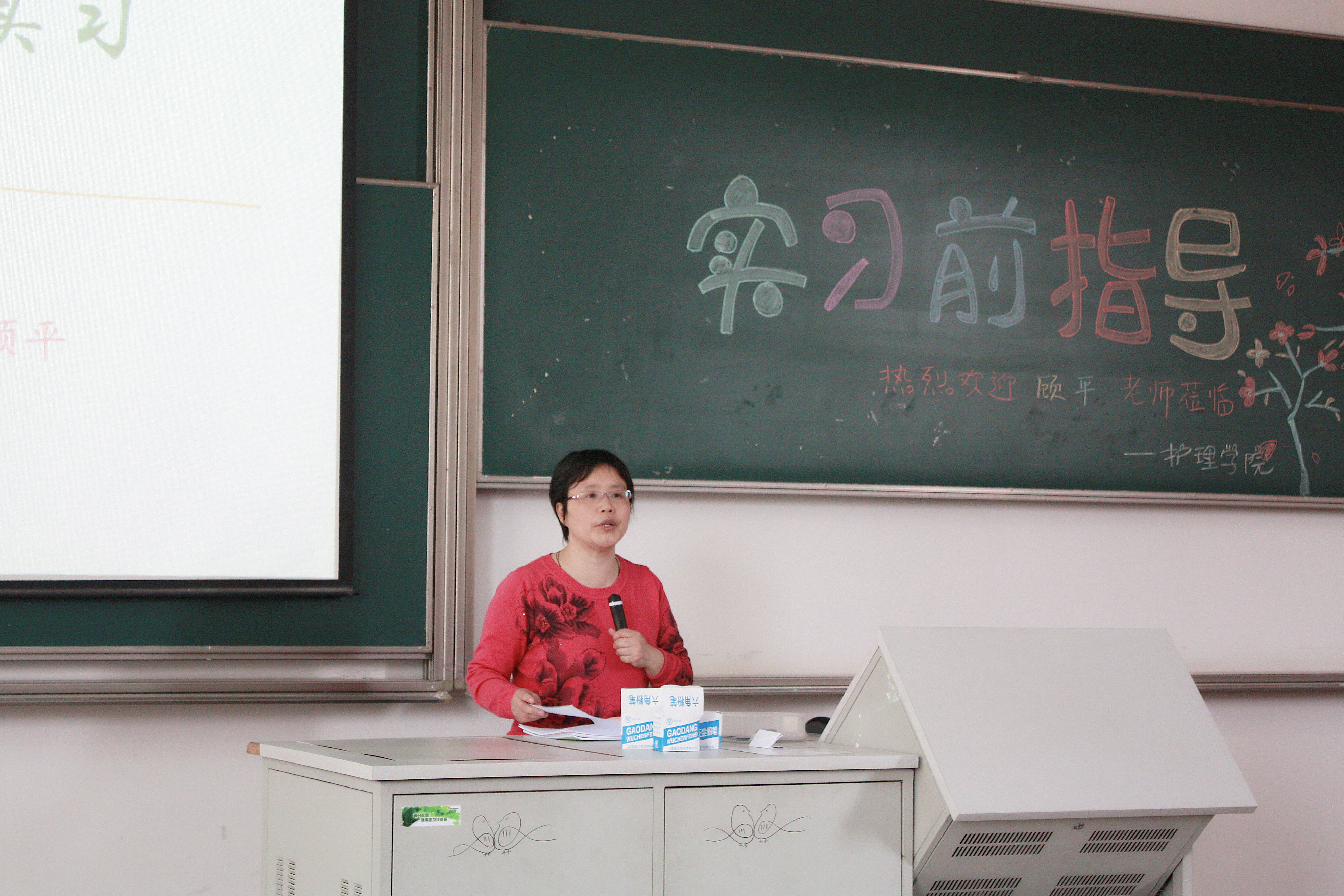 接下来,顾院长为同学们进行了以“愉快而充实的实习”为题的实习前指导。她首先交代了在实习点需要完成的学习任务和大概的安排。接着,她便从实习的重要性、实习规划、实习注意事项、毕业考试这四个方面展开话题,苦口婆心地指导着大家。顾平副院长强调同学们必须真正意识到实习的重要性,因为这一年是将课堂基础知识运用于临床的重要时期,做好学习与实践的接轨,为以后能尽快地适应各自的工作岗位打下坚实的基础。之后,她建议同学们在实习期间要树立阶段性的目标,在完成医院工作的同时,合理利用闲暇时间,抓紧时间学习理论知识,珍惜一年的宝贵时间,实习对于每一个学生而言都是一生中的唯一。另外,顾平院长也对同学们提出了许多要求和希望:端正实习态度,摆正自己实习生的位置;最为护士,同学们要时刻谨记医院纪律,规范操作,注意仪表;再次强调加强安全意识;处理好人际关系;重要的是,怀着一颗感恩的心来过好人生中唯一一次的实习生活。她希望同学们随时在心中提醒自己作为医学生的职责:学习,为自己一年后的护士毕业考试提前做准备。
