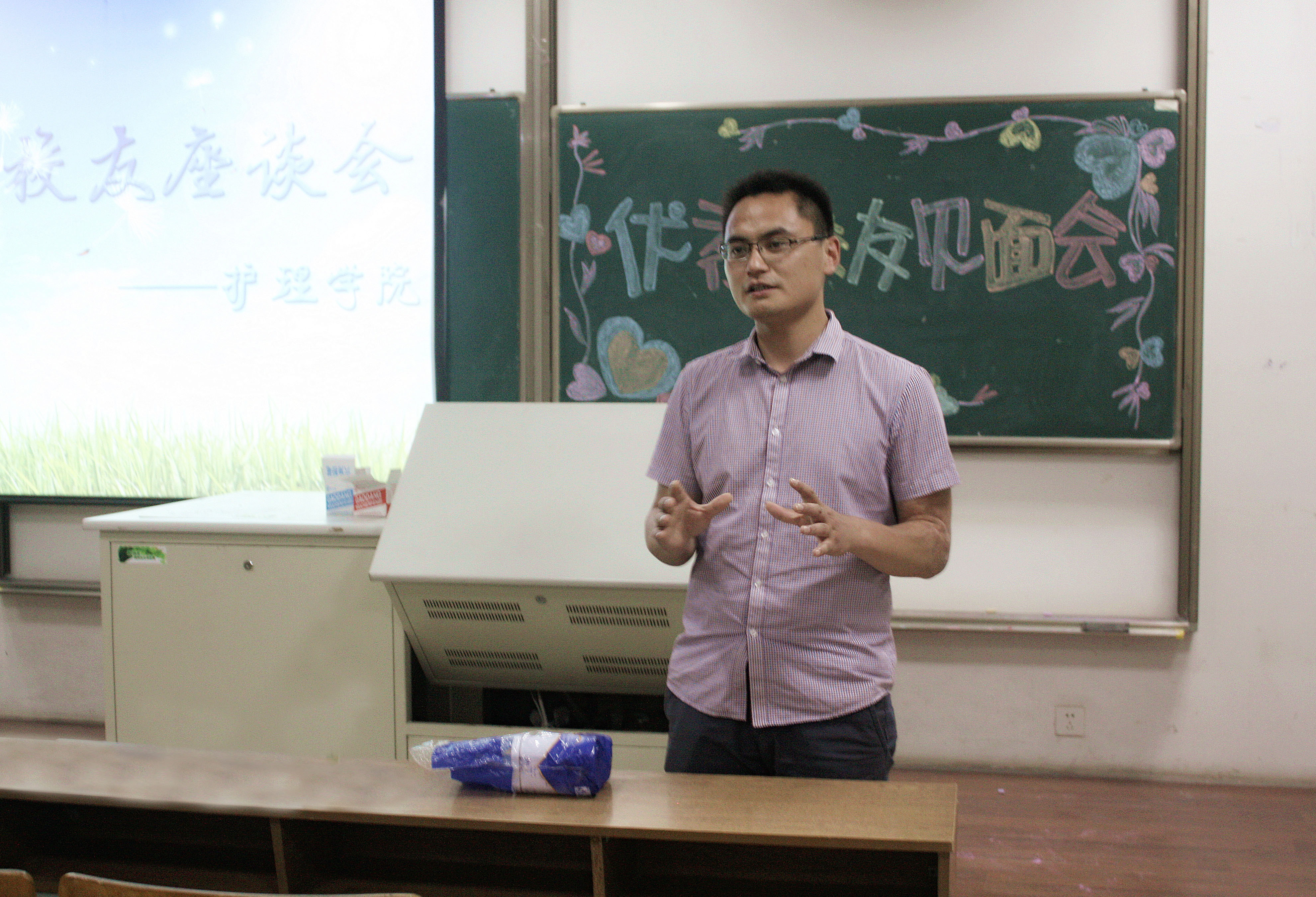 首先,徐晔星老师介绍本次交流会的两位嘉宾王家麟和陈秋菊。王家麟学长目前就职于本校国际教育学院学工办,陈秋菊学姐是鼓楼医院急诊科护士。简短介绍后,陈学姐用幻灯片向大家展示了医院的护理人员结构以及分区管理模式。让大家对医院护理人员的工作模式有了一定的了解。随后是提问环节,同学们提出的问题涉及多方面,有关于实习分配情况的,有关于护理科研工作的,有关于工作时间安排的,甚至还有关于以后工资高低的。学姐耐心地一一作答。当大家问到该如何成为一名优秀的护理人员的时候,学姐认真地回答道:“不断学习,不断积累经验!”另外,学姐还鼓励大家在校期间一定要抓住各种机会为自己的将来添砖加瓦。即便是参加工作后也要利用好医院给予的外出学习的机会。这些不管是对自己未来的发展还是提高自身能力,丰富阅历都是大有帮助的。她还特别提到本科生一定要加强操作能力,这也是她进入医院后所深刻体会到的本科生在这方面上与大专生的差距。王学长则主要和大家谈了一些自己留校的经历。同时告诉大家不要轻易放弃自己的专业,并且提出了对大家在校能够多与老师和同学交流的期望。最后,在徐晔星老师的一番对“青春”的感言下,交流会圆满地落下了帷幕。