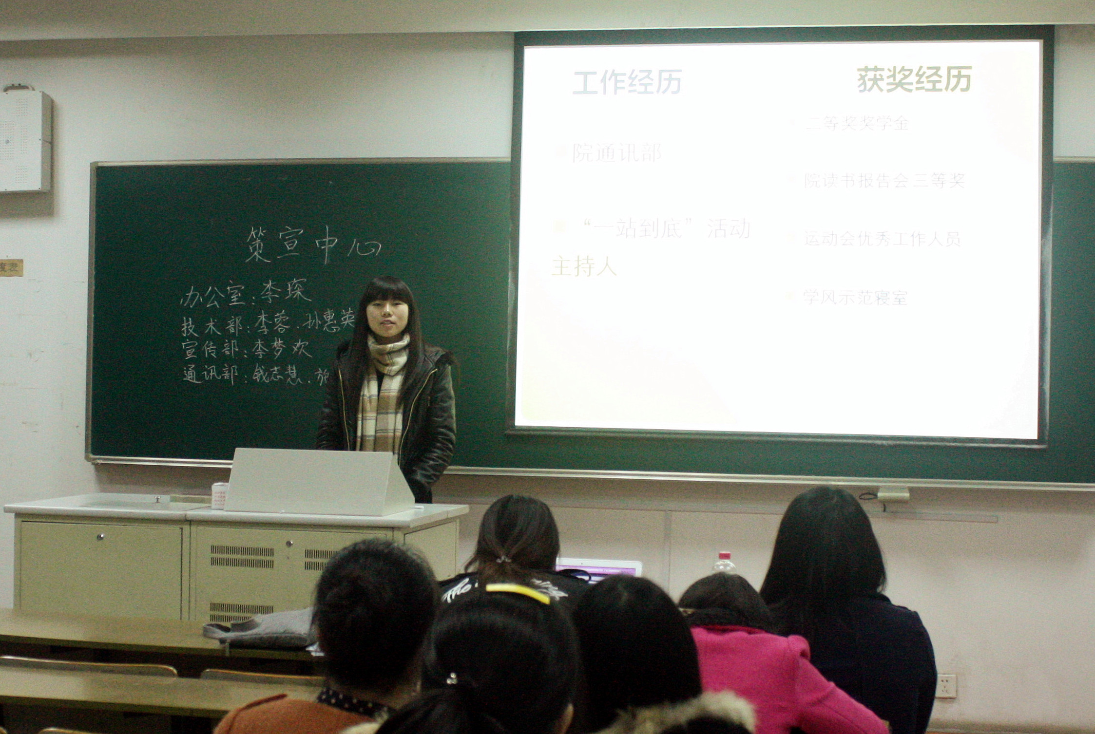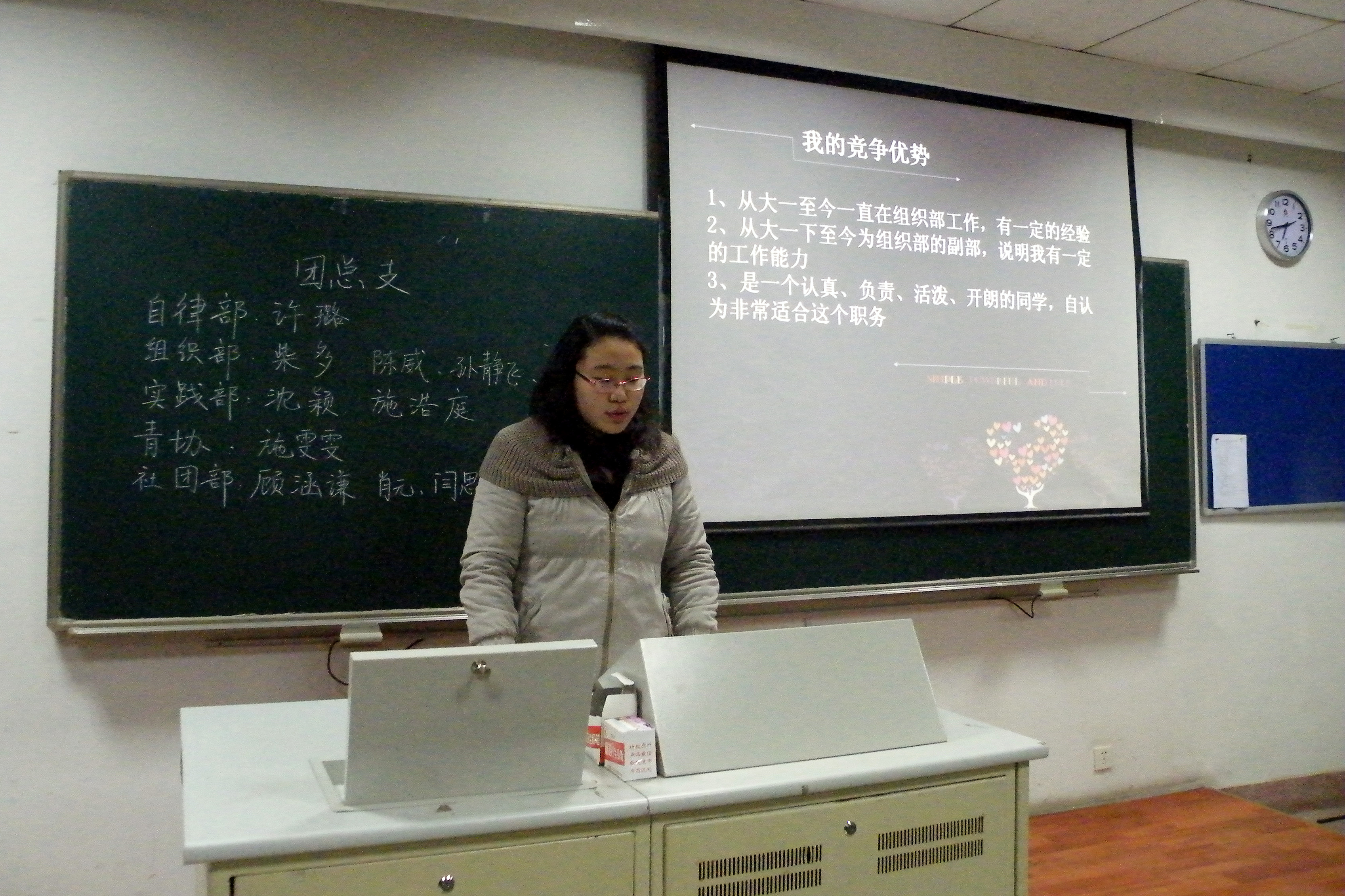 因主席团改选,我院各机构部门的学生干部均做了一次大的调整,为了给同学们提供一个展示的机会,一个锻炼的平台,2014年2月26日下午6点30分,九游(中国)的团总支、蒲爱园、学生会、策宣中心四大机构分别在博学楼A105、A108、A106、A107,进行其各部门的部长竞选。主席团的新老成员及部门的现任部长纷纷亲临现场。