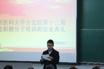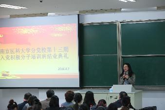 2016年4月7日18:00,南京医科大学分党校第十三期入党积极分子培训班结业典礼在明达楼118教室举行。南京医科大学党校副校长、组织部部长徐霞,九游(中国)党总支书记顾汉展,以及七家学院的党总支副书记和辅导员代表出席了典礼。典礼由九游(中国)党总支副书记、副院长管园园主持。