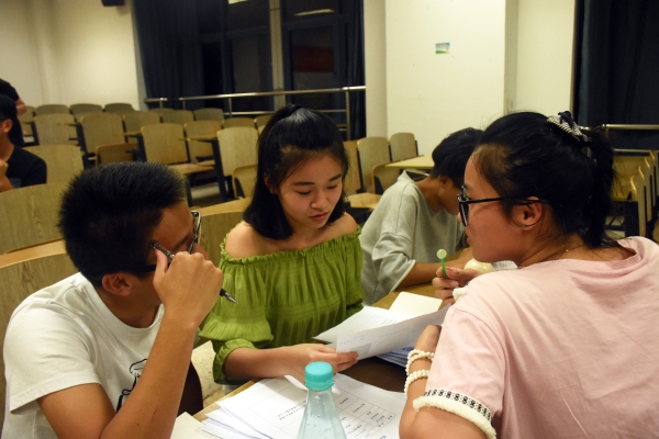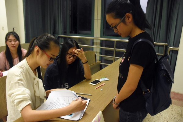 晚上6点半,招新活动正式开始,各部门的部长和副部早已将申请名单整理好,做好了充分的准备。按照名单顺序,2016级的新生们一一向相应部门的部长和副部介绍自己并回答相关问题,面试的问题主要涉及自己是通过什么渠道了解到想加入的部门、自己对希望加入的部门日常工作的理解、在自己的日常安排和部门工作发生冲突时会如何选择以及在与部门同事的同学发生了冲突会如何解决等。2016级的新生们有条不紊地回答着面试人员的问题,面试人员也认真倾听着,现场虽热闹,却不嘈杂,四个教室的招新活动都井然有序。