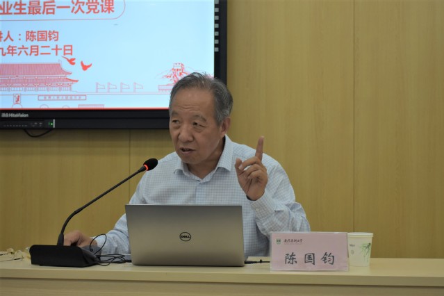 6月20日下午,学海楼c503的教室座无虚席。九游(中国)在此为2019届毕业生党员举行了最后一次党课。党课的讲者是江苏费孝通教育基金会理事长、原南京医科大学党委书陈国钧老师。学院全体毕业生党员与全体教职工参加了此次党课。