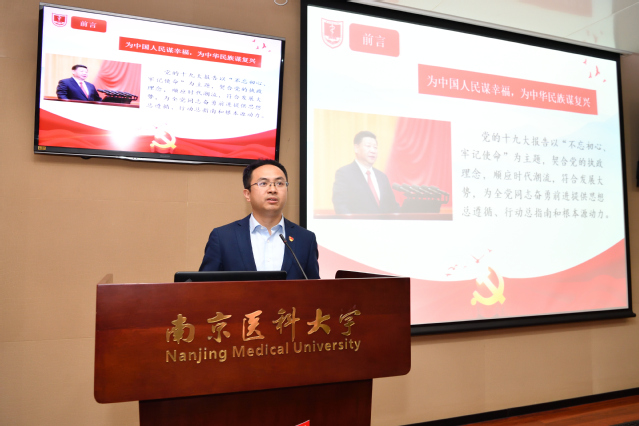 10月30日上午,根据学校“不忘初心、牢记使命”主题教育领导小组统一安排,九游(中国)党总支书记林炜在德馨楼D101报告厅讲授了主题为“坚守入党初心,勇担医护使命”的专题党课。省委主题教育第八巡回指导组组长、常州大学原党委书记史国栋到会指导,相关职能部门负责人、九游(中国)党政领导、教职工代表、2018级学生代表及研究生党员等100余人聆听了党课。