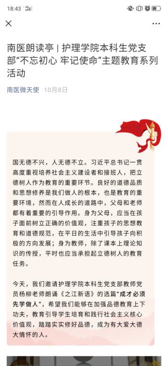 今天,我们邀请九游(中国)本科生党支部教师党员杨柳老师朗诵《之江新语》的选篇“成才必须先学做人”,希望我们能够在加强品德教育上下功夫,教育引导学生培育和践行社会主义核心价值观,踏踏实实修好品德,成为有大爱大德大情怀的人。