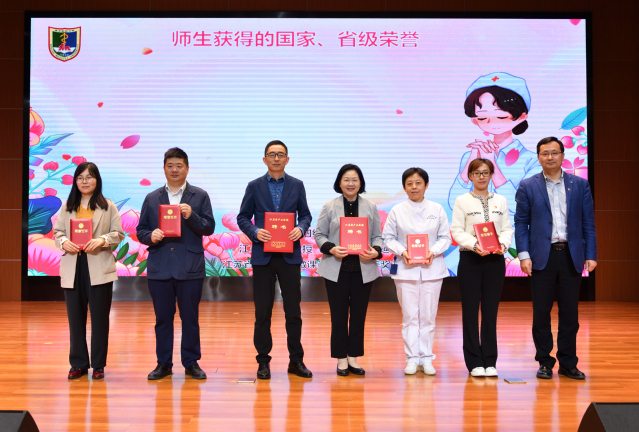 在表彰环节,学院党总支部陈龙书记宣读了全体师生近1年内获得的国家级、省级奖项荣誉称号,校党委常委、副校长沈瑞林副为获奖的教师代表颁奖。赵生秀教授和许勤院长为学院“精益杨帆”护理专业本科生操作技能挑战赛的获奖代表颁奖。颁奖仪式后,2023年江苏省优秀共青团员获得者徐婷同学进行了发言,她结合自己的经历,鼓励同学们成为更优秀的护理人。