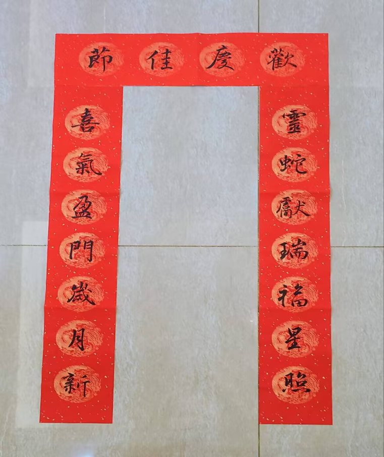 下联的“喜气盈门”描绘了一种充满喜悦和欢乐的氛围,喜悦之气充满了整个家门,全家都沉浸在欢乐之中。“岁月新”则点明了时间的更新,代表着新的一年、新的开始,蕴含着对未来美好生活的期待与憧憬,希望在新的岁月里一切都是崭新的、美好的。