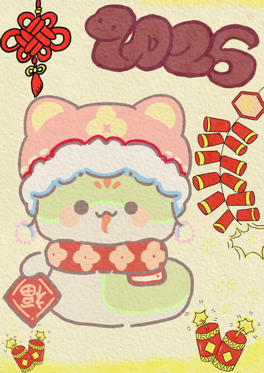 该绘画作品以灵动小蛇为主体,“祥蛇纳福,新春送喜”,“福”字倒挂,祈愿“福到”。中国结,展现中华传统文化,象征吉祥如意,线条交织环绕承载人们对家庭团圆的期盼。蛇年到来,人们点燃爆竹,除旧迎新。2025是蛇年,我们都将如灵蛇般游刃有余,蜕变成长!