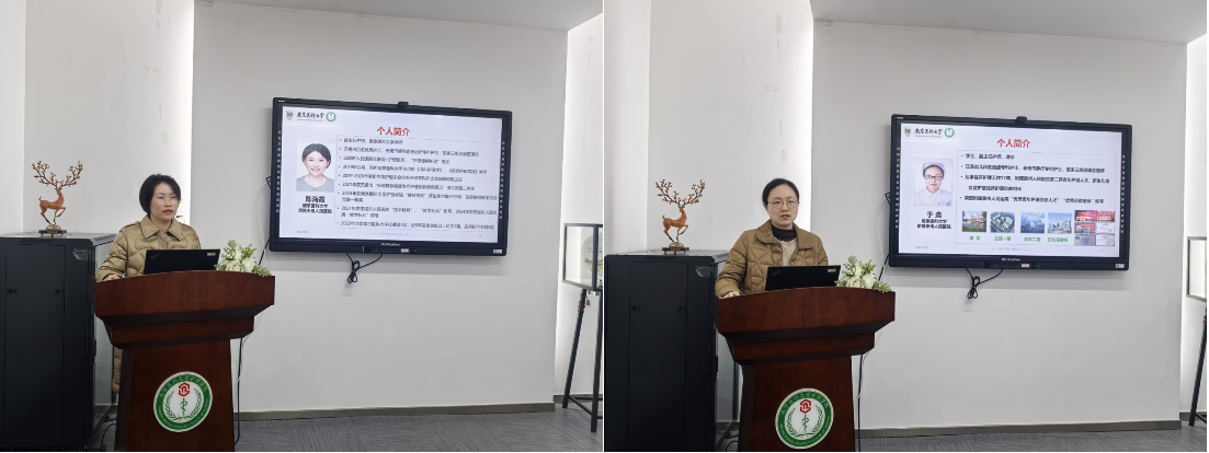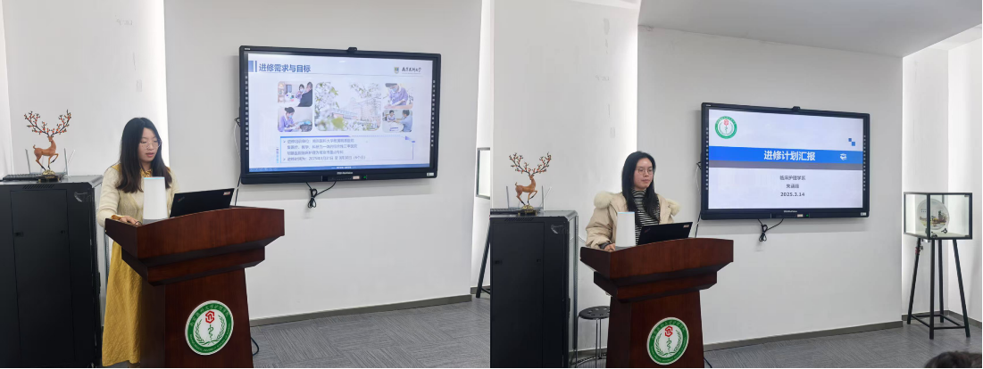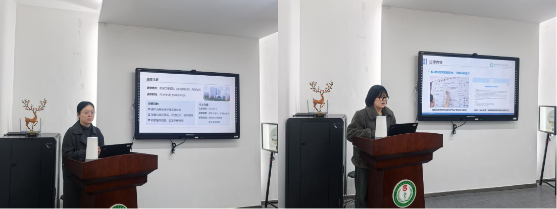 随后,学院2名青年教师汇报外派进修计划。临床护理学系青年教师朱涵菲及基础与社区护理学系青年教师郭敏分别围绕自身的发展方向、进修目标、学习内容、预期成果等方面进行了详细汇报。