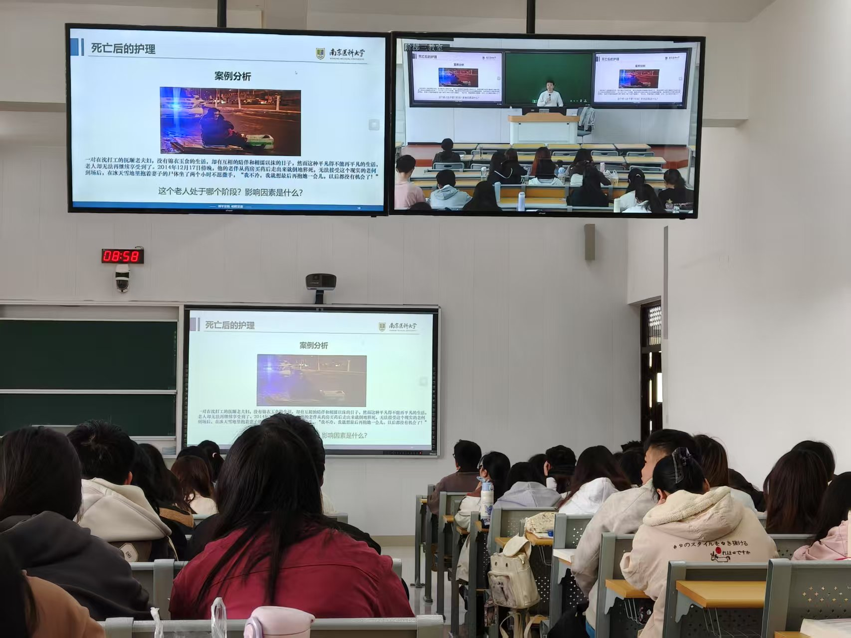 丁婧婧老师在《冷热疗法》这一章,结合临床实例生动讲解了冷热疗法的适应证、操作要点及注意事项,并通过案例分析引导学生进一步明确冷热疗法规范操作的重要性。陈申老师在《临终关怀》章节中,以临终关怀理念为核心,采用丰富的案例阐述临终患者的生理、心理护理与家属支持,引发学生对生命伦理与护理职业价值的深刻思考。两校区学生在讨论环节认真思考、踊跃发言,线上线下的教学形式与思想碰撞为课堂增添了更多活力。