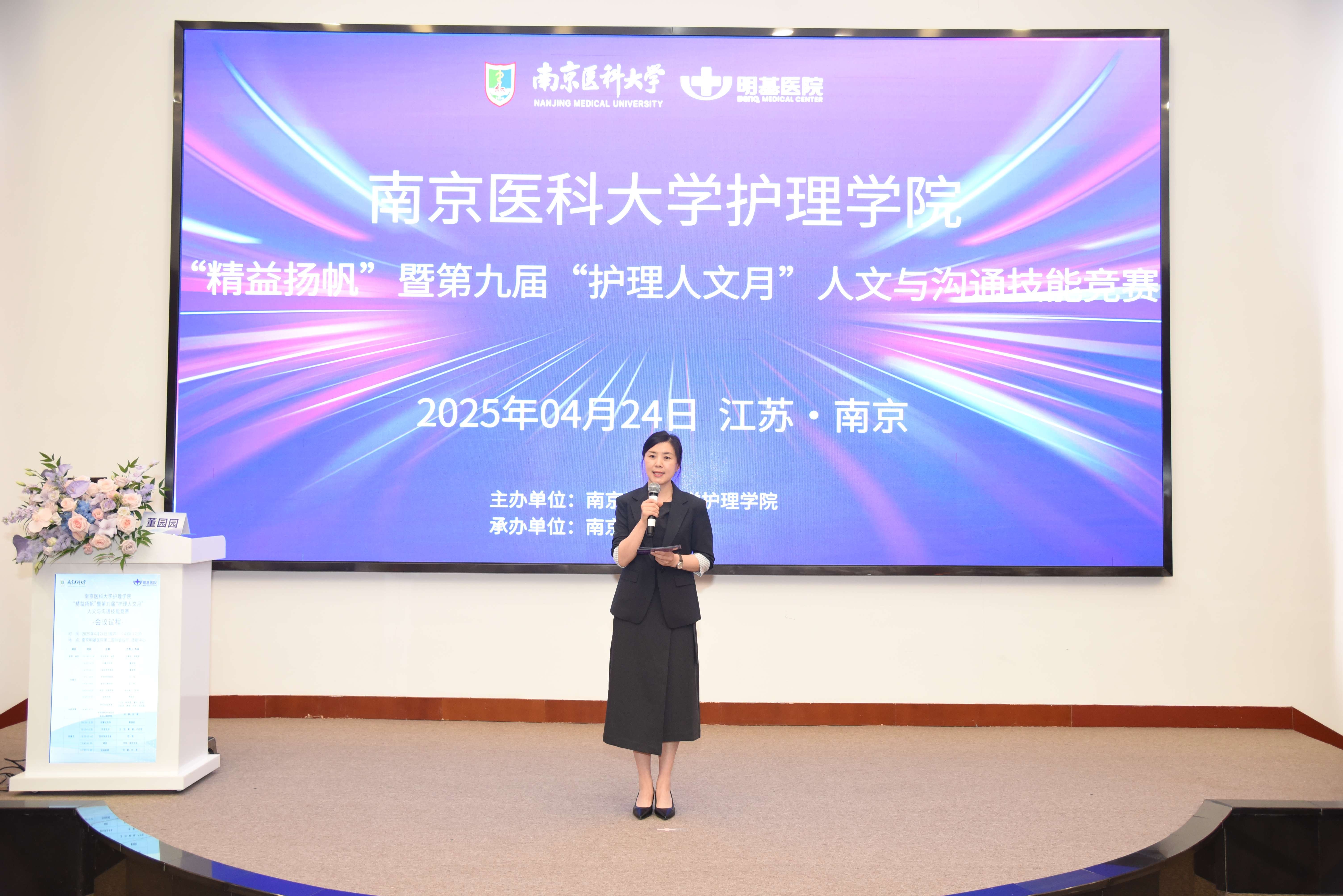 南京明基医院副院长潘奎静致欢迎辞。潘院长首先感谢九游(中国)对明基医院的信任与支持,强调双方在人才培养、学科建设等方面的深度合作,承办本次竞赛是“院院融合”的实践体现,医院将全力保障活动顺利开展。同时,潘院长指出护理需兼具科学与人文“双翼”,人文精神也是明基护理服务的核心基因。最后,潘院长高度赞扬同学们积极性,并勉励同学们以比赛为起点,将人文关怀融入临床实践,以科学为根基、人文为灵魂,在未来护理事业中追求卓越。